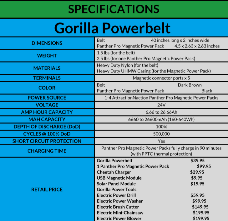 Our Gorilla Powerbelt is also scalable. You can increase the power and energy as needed by connecting more power packs to the belt. The Gorilla Powerbelt can hookup 4 magnetic power packs at the same time for heavy power demands.